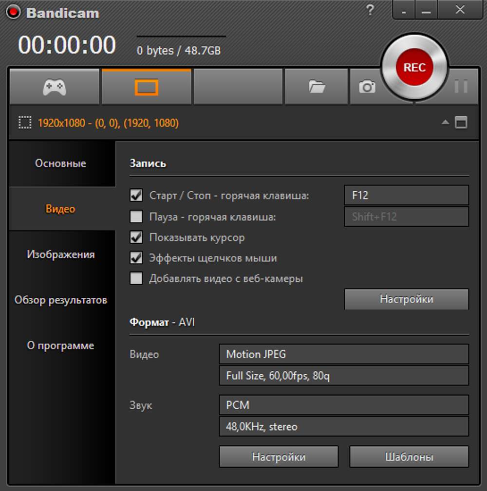 Bandicam - одно из лучших приложений для захвата видео с экрана Вашего монитора, а также и для снятия скриншотов в высоком качестве. Программа обладает простым управлением и полностью настраивается на требуемые параметры записи: можно сохранять видео или картинки как всего рабочего стола, так и